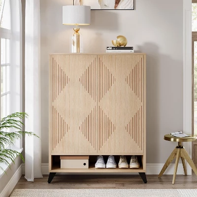 This piece is specifically styled with doors boasting an intricate geometric pattern, which can effortlessly augment any home decor. Departing conventional handles, our shoe cabinet incorporates an innovative rebound system. Simple and refreshingly user-friendly, a light press is all it takes to initiate access to your shoes.