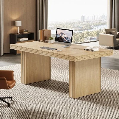 With its streamlined, elegant profile, the light wood tone exudes understated rustic allure. The 63″ W x 31.5″ D tabletop offers ample room for your computer, lamp, documents, keyboard, mouse, and beyond. Its 29.5″ height offers plenty of leg room to stretch out, ensuring a comfortable working posture throughout the day. The executive desk features a meticulously crafted wood-grain finish. Every simple line is thoughtfully designed to accentuate the wood’s natural beauty, fostering a warm farmhouse aesthetic that gracefully elevates the space.