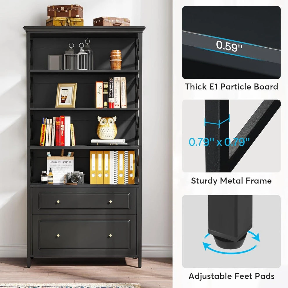 [ 2 Drawers File Cabinet with Shlef ]- Tribesigns dark grey and black office file cabinet featured folder drawer, & regular drawer will provide convenient storage for your important documents, files,etc.. Deep and spacious bottom folder drawer with hang rails accommodate A4, F4, letter sized and legal sized suspension files.[ 4-Tier Open Shelf Design ]- Say goodbye to cluttered desks and hello to an organized work environment. The file cabinet with 2 drawers and open storage shelves offers ample space for displaying your favorite books, frames, plants, or decorative items. Showcase your belongings in an organized and visually appealing manner.[ Practical and Multi-purpose ]- Whether you need a stylish black bookshelf for your home office, a black filing cabinet, or a versatile storage solution for any other room, Tribesigns 5 Tier Bookshelf with 2 Drawers is the great choice. Its practical and multi-purpose design ensures that it can fulfill all your storage needs, while adding a touch of sophistication to your space.[ Sturdy and Reliable Construction ]- Crafted with high-quality particle board and iron pipe, this vertical file cabinet with drawers and bookshelf is built to last. Extra X cross bar on both sides enhance the stability of the heavy duty bookshelf with file cabinet, allowing it to withstand both the weight of your belongings and the test of time. The surface is easy to clean, making maintenance a breeze.[ Easy to Assemble & Buy with Confidence ]- The vertical file cabinet with hutch comes with all the necessary tools and detailed assembly instructions, making it easy to assemble. We provide quality assurance and friendly customer service for Tribesigns industrial black file cabinet with bookshelves. Feel free to contact us if you have any question with our Tribesigns products.
