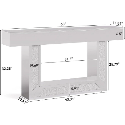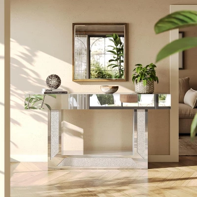 Reflect light and elegance in your space with this 63-inch mirrored console table, featuring two sleek tiers and a sturdy heavy-duty base in a radiant silver finish. Designed to fit seamlessly behind sofas or in entryways, it offers a glamorous surface for displaying decor while creating an illusion of spaciousness. Perfect for modern living rooms, it combines functional storage with contemporary sophistication to elevate your home’s aesthetic.