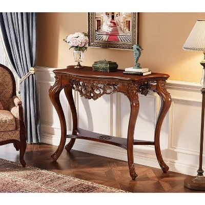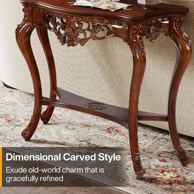 With its traditionally elegant design, this 38-inch carved curved console table exudes a hint of vintage charm, making it a perfect addition to any living room or entryway. The 2 tier console table has a distressed brown finish, revealing a natural grain that contributes to its rich, deep hues. This characteristic, combined with its traditional styling, makes this piece an ideal choice to introduce a nostalgic touch to the home décor.