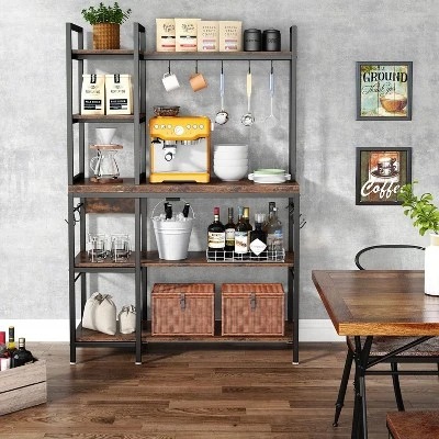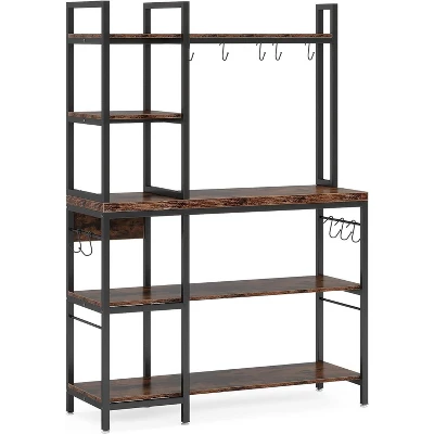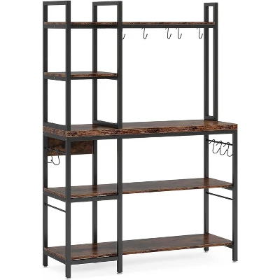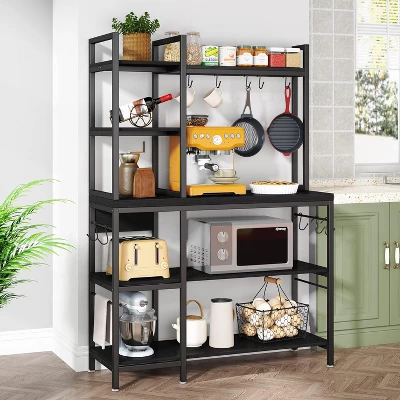 Equipped with 3 large lower shelves and 2 upper hutches, and extra 10 hooks for pots or cups, this industrial baker’s racks offers plenty of space for kitchen storage and Free up more counter space. 5-Tier bakers rack is ideal used as kitchen rack, microwave stand kitchen bakers racks with storage, coffee bar station, etc.. 10 hooks make it convenient to hang some cooking tools like pots, spoons, pans or whisk. Large bakers rack provides plenty work area for your oven, microwave and other kitchen supplies and space to prepare food.