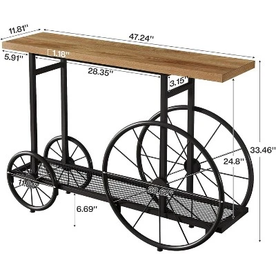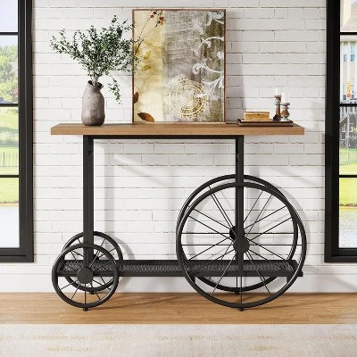 The 47.2-Inch Tribesigns hallway table boasts a rugged design with a rustic brown finish and striking black metal accents. Its cart-inspired design is perfect for adding a touch of industrial flair to your entryway or living room. Ideal for various settings, this 2-Tier industrial foyer table can function as an entryway console, behind-couch table, or even a stylish TV stand, seamlessly enhancing the aesthetic of any room in your home.