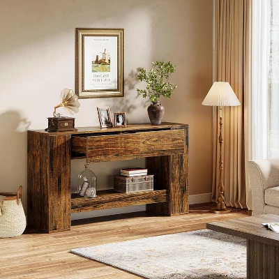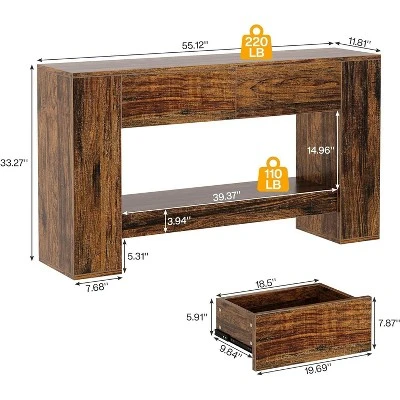 This console table seamlessly blends a simple design with a vintage wood grain finish, creating a charm that brings warmth and character to your home. Equipped with 2 hidden drawers, these pull out smoothly when you place your hand at the bottom. Crafted from high-quality MDF, the dimension is 55.1″ W x 11.8″ D x 33.5″ H. The thickened tabletop can support up to 220 pounds, while the lower shelf holds up to 110 pounds. This entryway table, with its unique color and storage drawers, is versatile. It can be used as a foyer table to decorate the entrance of your home, as a sofa table.