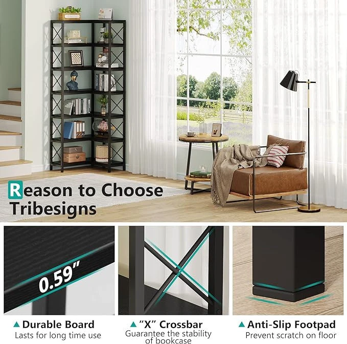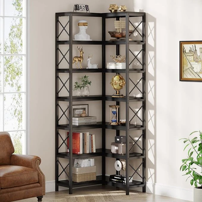 – ADD VISUAL CHARISMA Steeped in rustic style, this corner shelf with matte black frame, X-bars blends functionality and self-expression together, working as a real enrichment for the lovers of industrial design furniture. This 7-shelf bookshelf is a great solution to add extra space for living room, bedroom and small apartment.