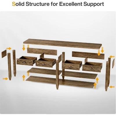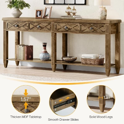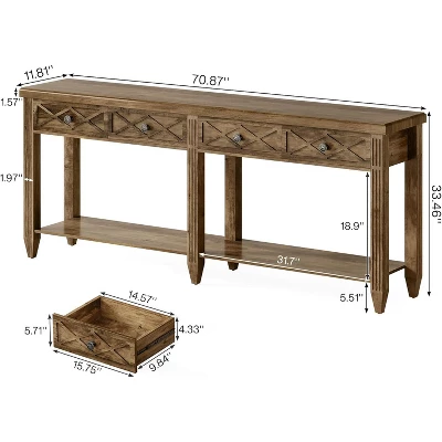 The 2-tier console table with a storage shelf is robust and built to last. It’s constructed with MDF and metal, offering ample storage and display space for any living room. This wooden console table measures 11.81″ D x 70.87″ W x 33.46″ H. The long sofa table with drawers is versatile and can be used as a sofa table, console table, entrance table, or hallway table.