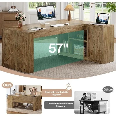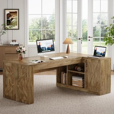 This L-shaped executive desk, crafted from premium MDF with an enhanced frame, offers robust support for desktop computers and monitors. Its scratch-resistant finish protects against daily wear, ensuring durability. This modern computer desk combines a distinctive barn-style aesthetic with charming farmhouse elements, enhancing any office space. The sophisticated leg design adds elegance to your home office, creating an inviting and productive environment.