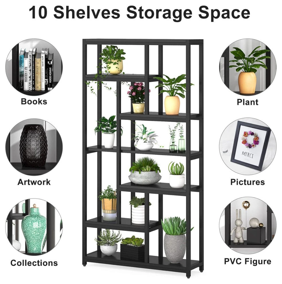 Ample Storage/: Features 10 open shelves, this tall bookshelf provide plenty of space for storing and displaying your books, photo frame, pottery, collections, plant, etc. Maximize the vertical wall space and also help keep room tidy and organized