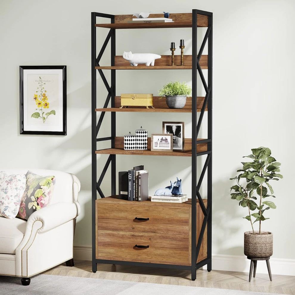 5-TIER RETRO BOOKSHELF:Tribesigns storage shelves,with 5 tier large ample space and 2 big drawers, provide a display area to store your books, vases, trophies, CDs, office supplies, and other decor items.Tall open shelf size: 25.19″(L) x 13.77″ (W) x 70.86″(H).