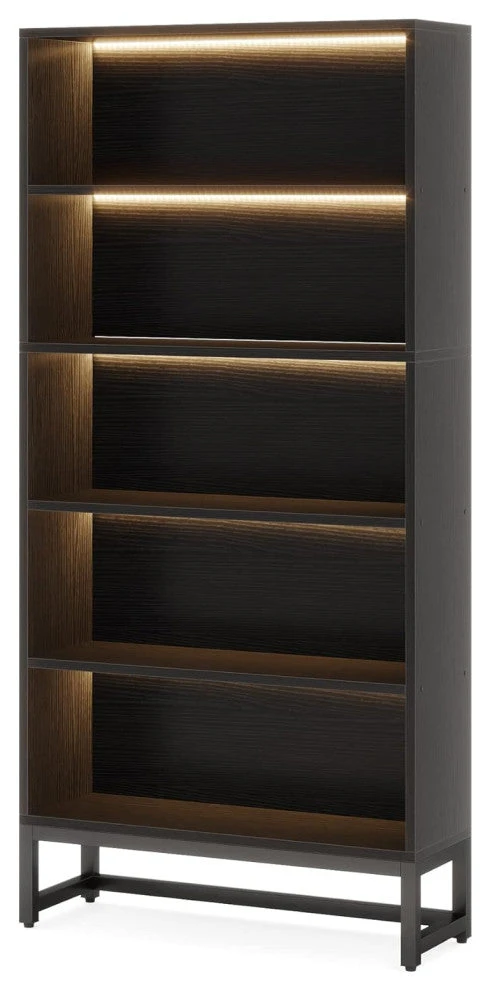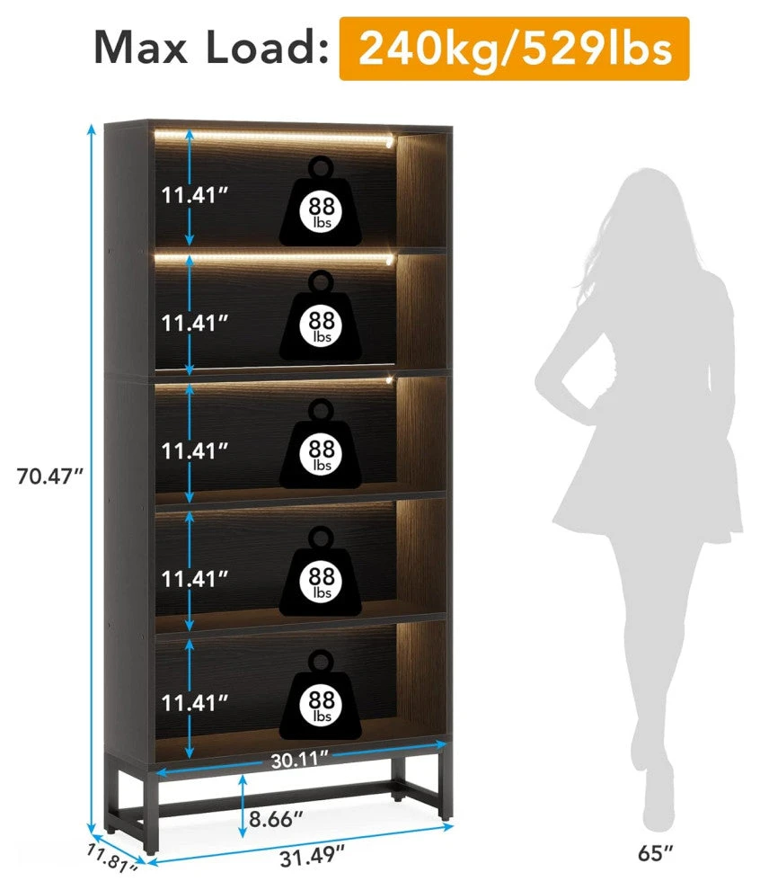 [High-quality with Amazing Load Capacity]: Made of thick particleboard and a heavy-duty powder-coated metal frame, this tall library bookshelf has a super large load capacity. Each shelf can load 88lbs. Totally 529lbs. The Shelves will NEVER sag under the weight of hardback books.[Great Size & Closed Back Shelves]: Overall size: 31.5″? L * 11.81″? W * 70.87″? H. Because of the great depth, it is a good home office decor to put your large books, dictionaries, figures, and models. Unlike other fragile cardboard, our closed backboard is made of thick particleboard.[5-Tier Bookcases with LED Litinging]: Each tier of our tall bookshelf is equipped with an APP-controlled LED light strip, which can be adjusted to any color and brightness you like. Item weight: 65.4lbs. Heavy and strong.[Safe Anti-dumping Kit & Adjustable Feet Pads]: For further security, we provide an anti-dumping kit to enhance the stability of the big bookcase. And this shelving unit has 4 legs that can be adjusted if you need to compensate for uneven floors, rugs, etc.[Multifunctional Shelving Unit]: High quality, overall beautiful look, ample storage space, making this deep bookshelf can be placed in the living room, bedroom, library, study, den, reception area, classroom,etc. Ideal as a bookshelf bookcase, display shelf.[Easy Assembly and Customer Service]: All labeled pieces and tools are included, strictly following the directions, it is easy to assemble. If you are not satisfied with our products, you can directly contact us, we will provide you with 18 months free warranty and a professional customer service team.