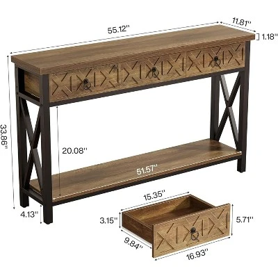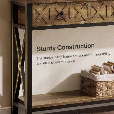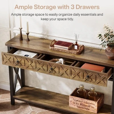 This entryway table features a rustic brown top, authentic metal drawer pulls, and a classic black metal frame. It instantly adds cozy character to your living space, enhancing warmth and aesthetic appeal. As a versatile console table for living room or hallway placement, this farmhouse design blends seamlessly. Position it near sofa to hold items, or use it as a statement piece with lamps or decor to elevate the ambiance.