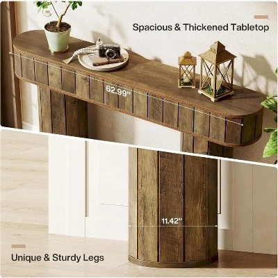 Elevate your home decor with this brown-finished foyer table! With its unique design, this farmhouse console table adds a touch of sophistication to any space, making it a standout piece to your home. This 62.99-inch console table is an ideal storage solution. Its tabletop offers ample space for showcasing lamps, framed photos, and more, while the space below can display baskets or bins, keeping items organized and easily accessible