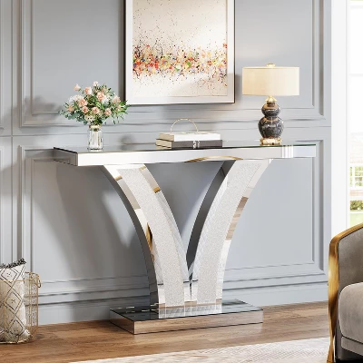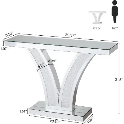 Elevate your space with our silver console table. Its mirrored surfaces beautifully reflect light, infusing any room with glamour. The unique v-shaped legs are adorned with crystal inlays, creating a captivating visual effect. This console table offers ample surface for displaying your favorite decorative items, such as a vase of fresh flowers, a stylish lamp, or cherished family photos. It’s the perfect place to drop your keys, mail, or handbag as you enter