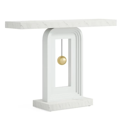 The Modern Console Table features a unique geometric base design that adds a touch of elegance to any living room, hallway, or entryway. The golden ball decor adds a sophisticated touch to the design. Measuring at just 39.4 inches, this narrow sofa entryway table boasts a modern and minimalist design that complements any living space. It is the perfect size for smaller entryways or as an accent table in larger living rooms.