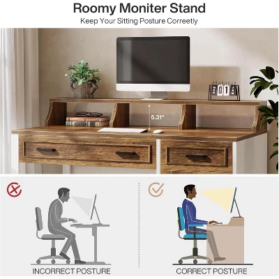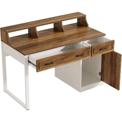 This executive desk includes a raised monitor shelf that helps align your eyes and screen, reducing neck strain during long work sessions—perfect for work-from-home comfort and focus. Equipped with 2 drawers, a cabinet, and open desktop storage compartments, this work desk keeps essentials within reach. Ideal for storing documents, gadgets, or personal items for a clutter-free desktop. Featuring a white frame with a rustic brown top, this farmhouse desk adds a warm, vintage charm to any room.