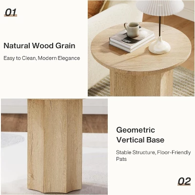 Featuring a round tabletop and vertical slatted base, this round end table highlights beautiful wood grain patterns that add texture and warmth, seamlessly adding a modern farmhouse or minimalist elegance touch to your home. Measuring 19.68″ L x 19.68″ W x 23.62″ H, with its space-saving round shape, this tall side table fits easily in small spaces like corners, next to armchairs, or beds — perfect for small apartments or as an accent in larger areas.